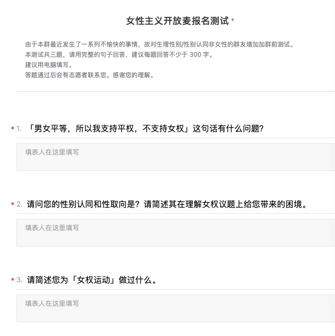 报名流程中,男性观众也需要经历更严格的审核,用小毛的话说,这三道测试题会让缺乏性别意识的男性“原形毕露”。而能通过测试的男性,说明他对女权主义有着一定的理论意识,至少达到了进入“相当女子”社群的最低门槛。