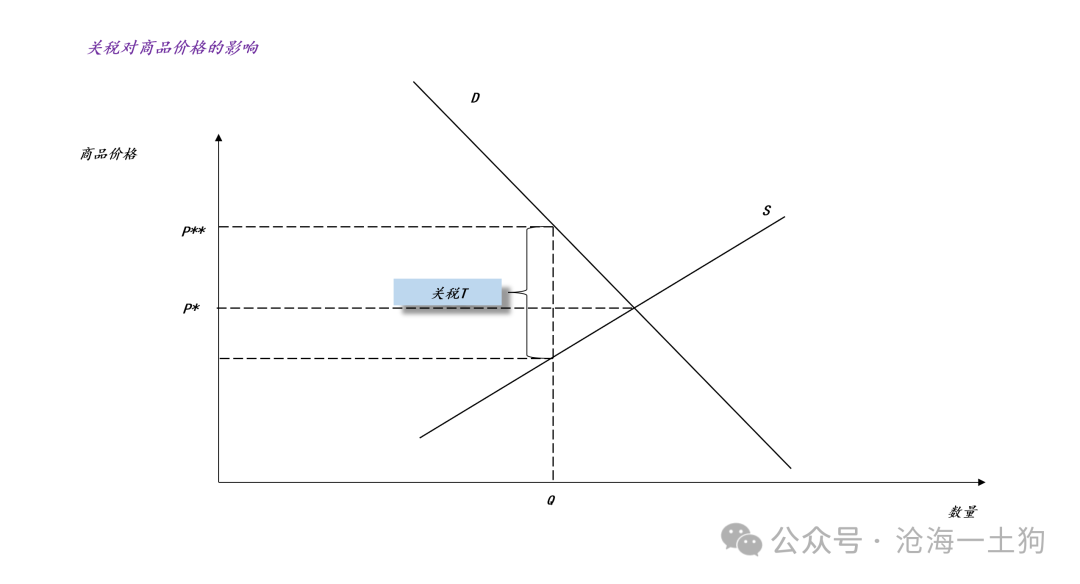 根据微观经济学常识,关税T由出口厂商和美国消费者共同承担,如何分配取决于供给曲线和需求曲线的相对弹性,越没弹性的一方承担得越多。如上图所示,需求曲线越陡峭,则需求曲线越没弹性,即消费者越难以找到替代品,于是,要承担更大比率的税负。