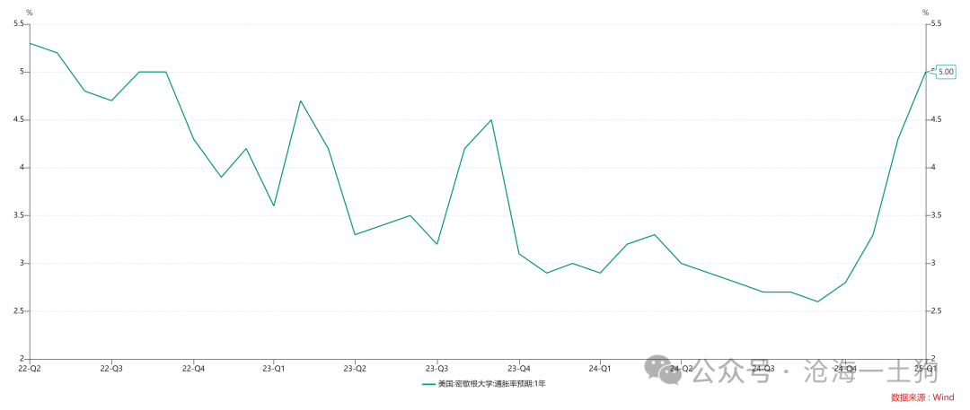 在“对等关税”落地之前,市场更关注“关税推高通胀预期”,如上图所示,美国通胀预期已经上升至5%(ps:调研数据来自于密歇根大学)。