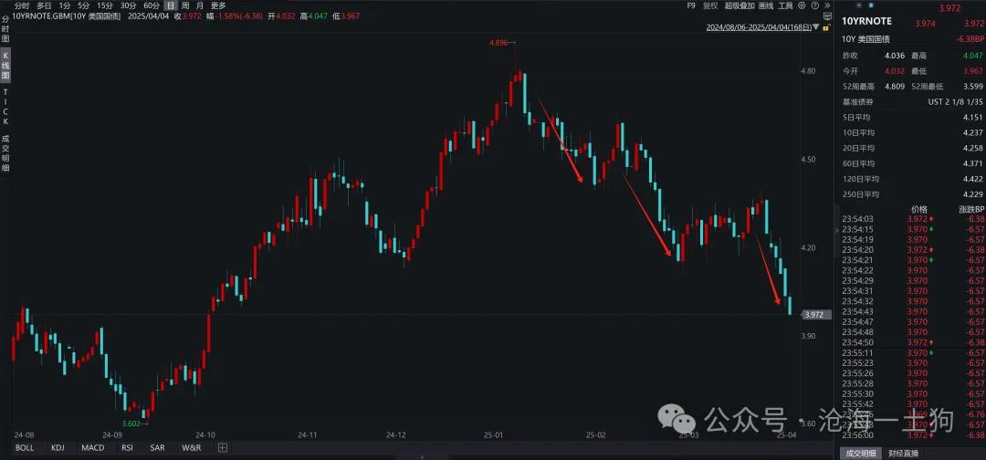 但是,随着“对等关税”的落地,情况又发生了变化,十年美债利率向下突破了4%。这意味着,市场不再担心“关税推高通胀预期”,转而去认为“加税会抑制住美国消费”。