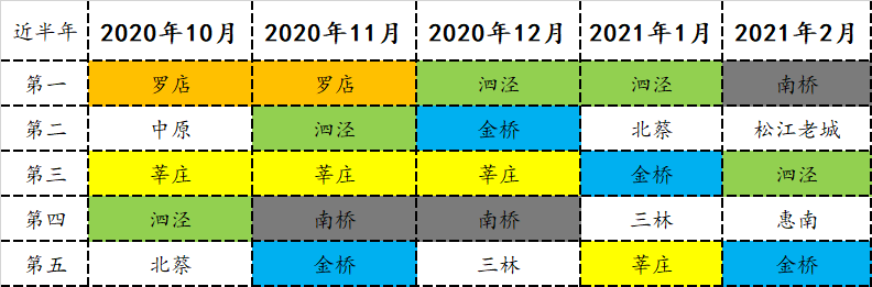 过去半年各板块的走量情况,从去年10月到今年2月,固定有几个板块的成交是比较活跃的:泗泾、金桥、莘庄。