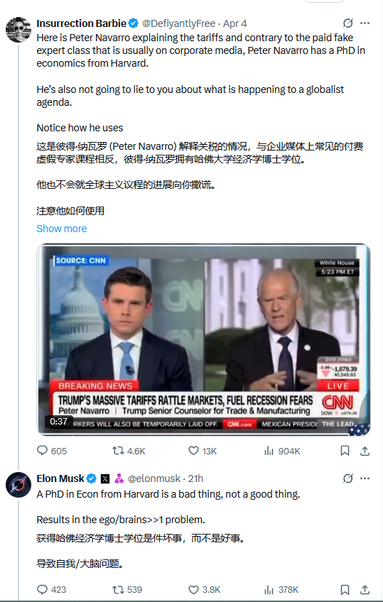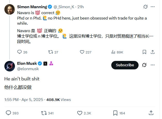 周五早晨,马斯克在其社交媒体平台X上针对一位用户对纳瓦罗的辩护作出了尖锐回应。该用户称纳瓦罗作为一位拥有哈佛经济学博士的人,在关税问题上有发言权。