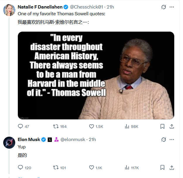 一个读者引用了托马斯·索维尔的名言:美国历史上每次灾难,总少不了一个来自哈佛的人。马斯克当即回复“是的”,表示赞同。