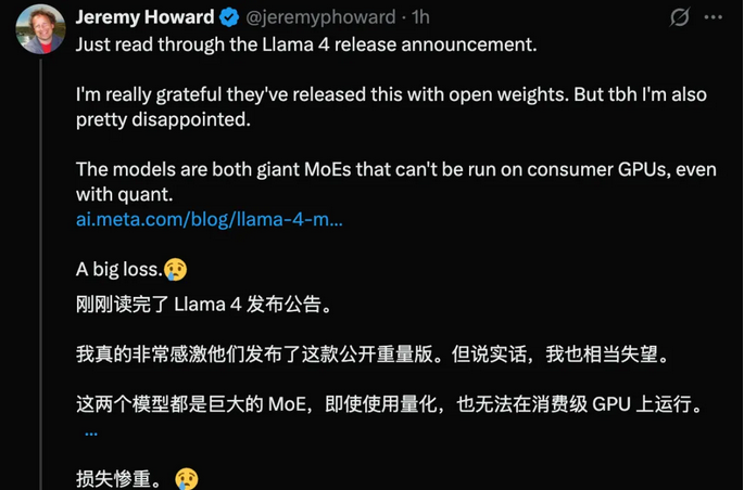 前kaggle总裁,fast AI 创始人Jeremy Howard表示,虽然感谢开源,但Llama 4 Scout 和 Maverick 都是大型 MoE 模型,即使量化后也无法在消费级 GPU 上运行,这对开源社区的可及性来说是个不小的损失。