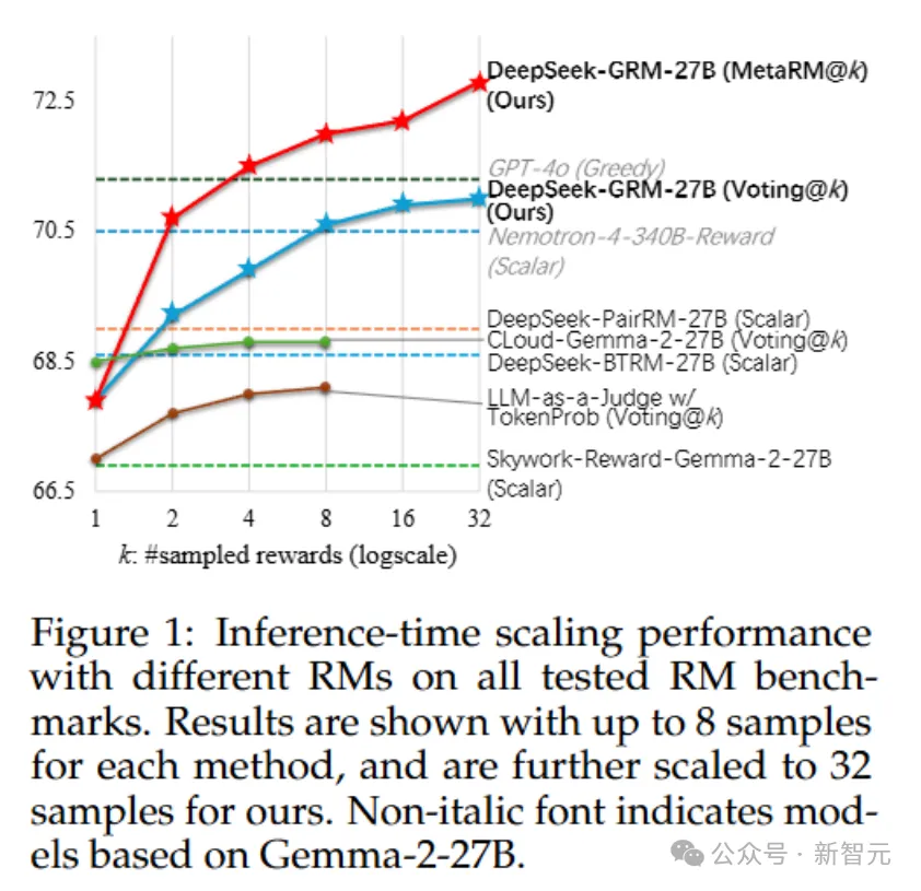实验结果显示,DeepSeek-GRM-27B在多个RM基准测试中显著优于现有方法和模型,尤其是在推理时扩展性方面表现出色。通过增加推理计算资源,DeepSeek-GRM-27B展现了强大的性能提升潜力,证明了推理阶段扩展策略的优势。