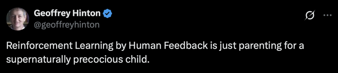 但AI教父、诺贝尔奖得主Geoffrey Hinton明确对RLHF持批评态度,他最早曾说,“通过人类反馈进行强化学习,就像是在养育一个早熟得超自然的孩子。”