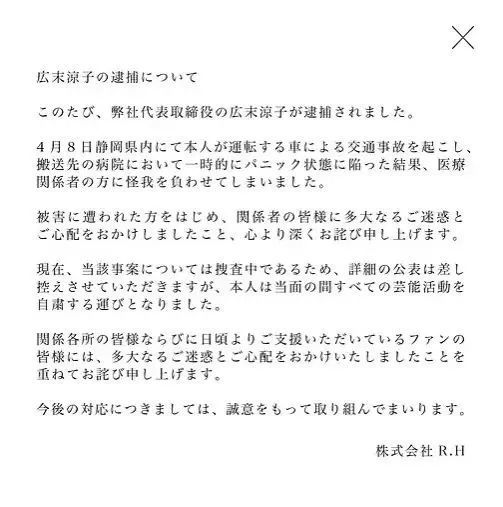 广末凉子的个人事务所在事件后迅速发布了道歉声明,表示她在事故后陷入短暂恐慌,情绪失控,伤害了医疗人员。事务所向受害人及相关人员致歉,并宣布广末将暂停一切演艺活动,也向长久以来支持她的粉丝致歉。