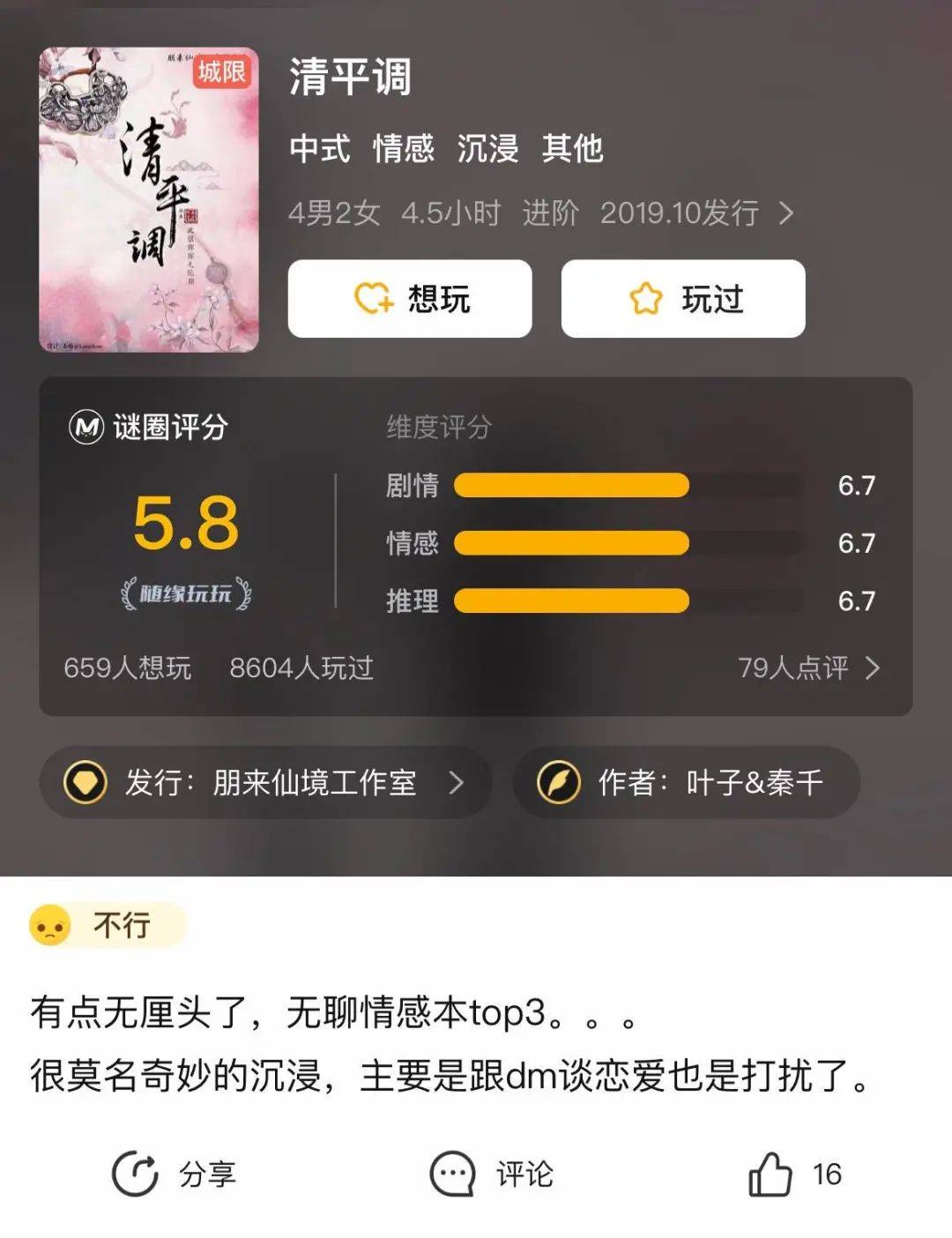 如果要论起源,以DM为恋人的情感本由来已久。据资深玩家小寒回忆,她打的第一个DM谈恋爱的剧本叫《清平调》,是一个2019年发行的本。玩家在5小时里经历三生三世的纠葛,6个玩家中有一个的恋爱线和DM展开,但在当年,玩家对于和DM谈恋爱这件事多少还有些接受无能。