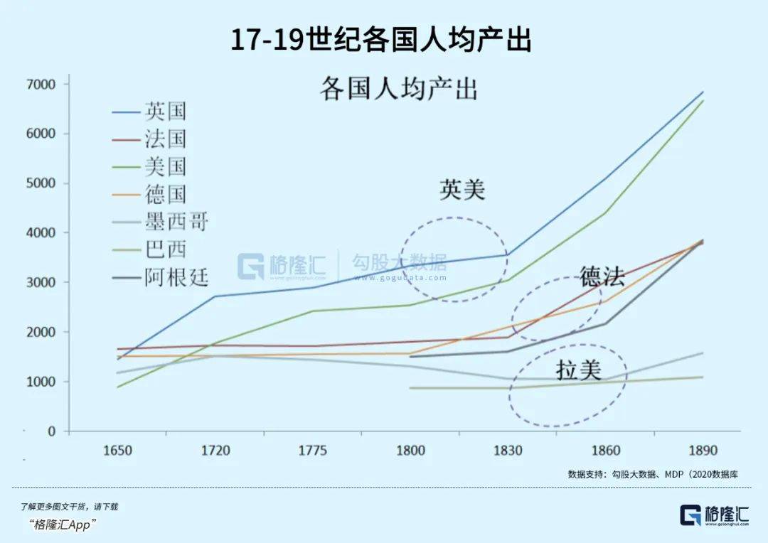 根据Maddison Project Database的经济史数据,看下图。早从1720年开始,13块殖民地的人均产出就超越德法,仅次于英国本土。