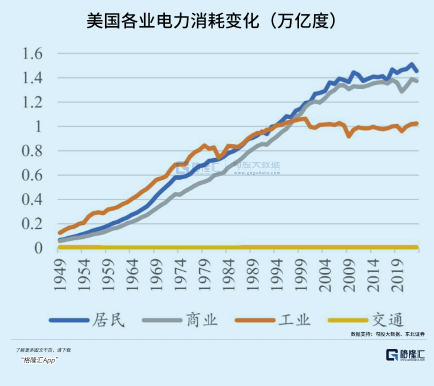 2023年,美国总发电量约4.3万亿度,工业用电量约1.01万亿度,占比约23.6%。