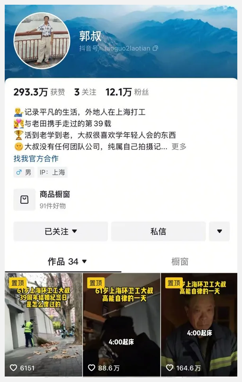 李薇最近也沉迷于这些老年博主的视频,常常一刷就是半天。她最常看的账号名为“郭叔”,账号主人今年61岁,是上海的一名环卫大叔。他的视频内容很简单,几乎都是日常Vlog,记录自己一天的生活——凌晨四点起床做饭,天刚亮就出门扫地,中午回家继续做饭,接着又回到街头扫地,直到晚上八九点才结束工作。