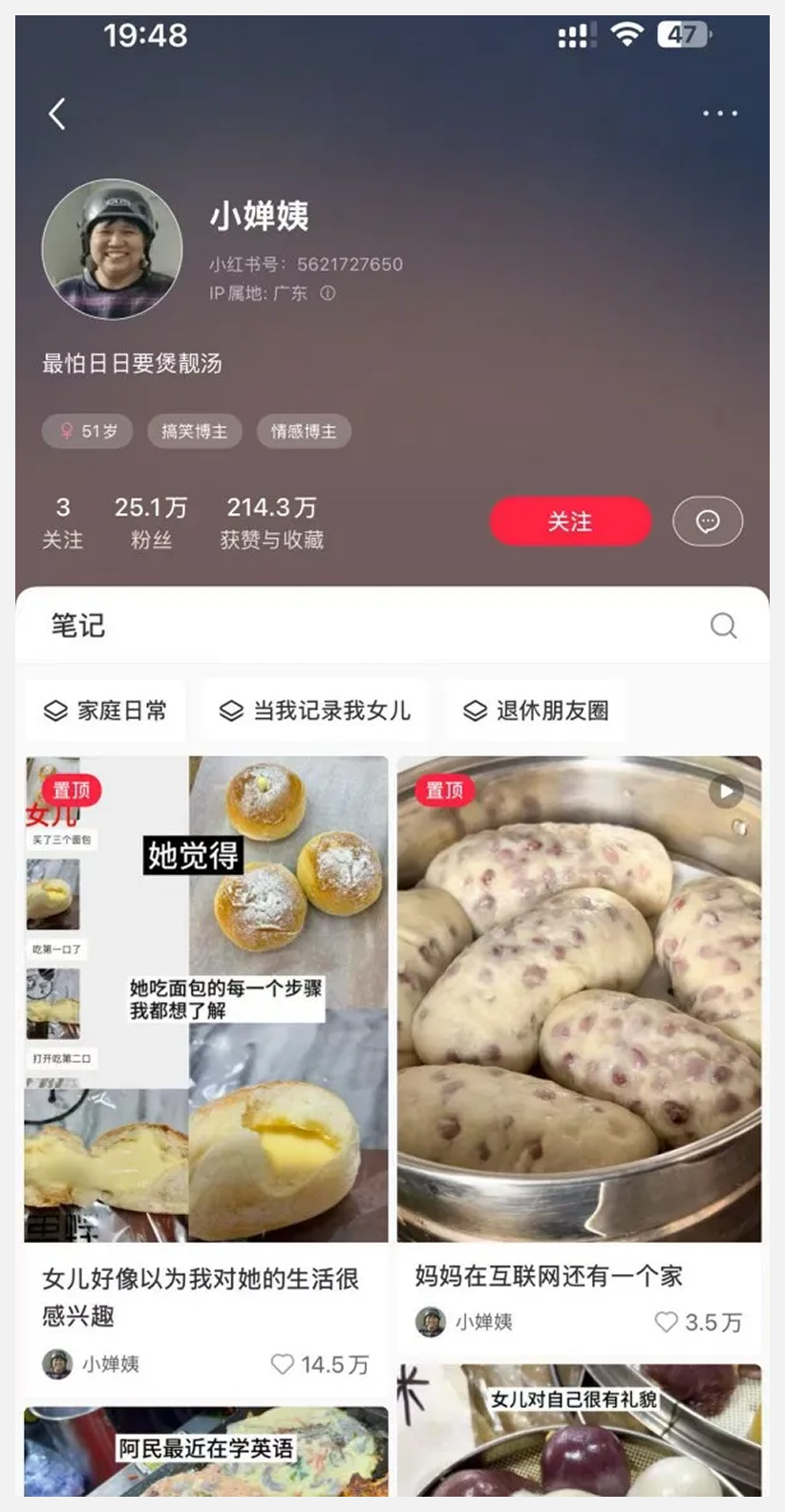 有时,即使家中长辈健在,部分年轻人仍然会对中老年博主产生情感上的寄托。王月翻开自己的关注列表,发现自己关注的老年博主并不多,其中最常看的一个是名为“小蝉姨”的账号。