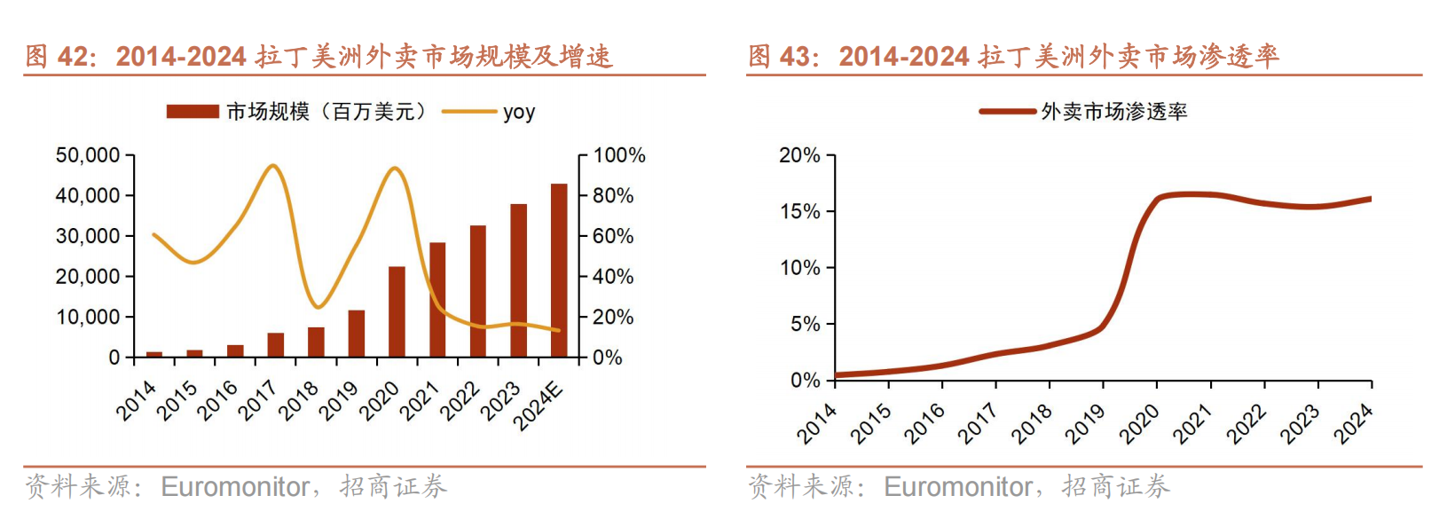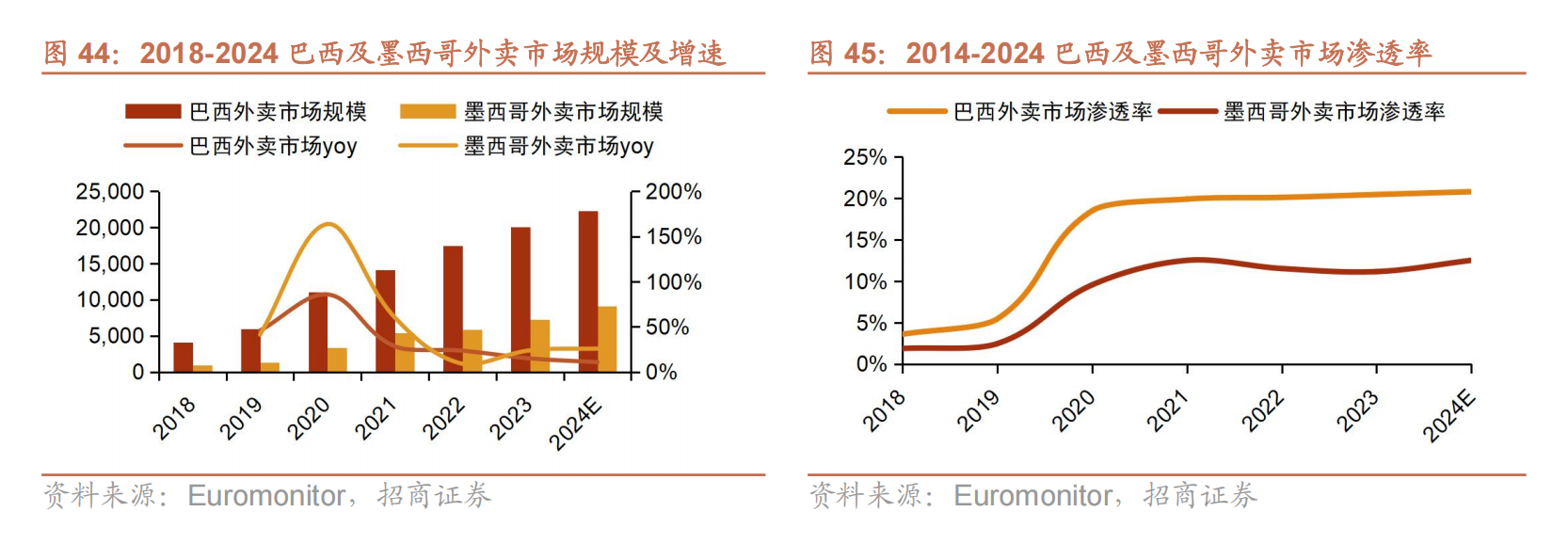 可以说,拉美是全球当下最具潜力的外卖市场之一,而巴西和墨西哥分别占据拉美外卖市场前两名,这两个国家2023年的外卖市场规模分别达到约200亿美元和72亿美元。