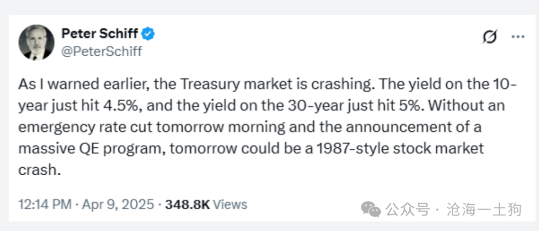 对于这一现象,著名投资人Peter Schiff在X上发了一段有些危言耸听的话,大意是:如果明天早上不紧急降息并宣布大规模量化宽松计划,明天可能会出现 1987年式的股市崩盘。
