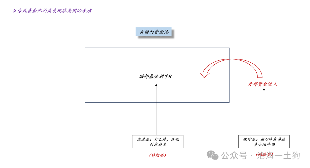 从这个视角看过去,我们就能明白为什么特朗普是激进派了,他认为,整个金融系统还有得救,快速地降低付息利率不会导致资金池出现破裂;但是,以鲍威尔为代表的保守派则不这么看,他们认为,即便要降低付息成本也要缓慢地降,不要导致资本大量外流。