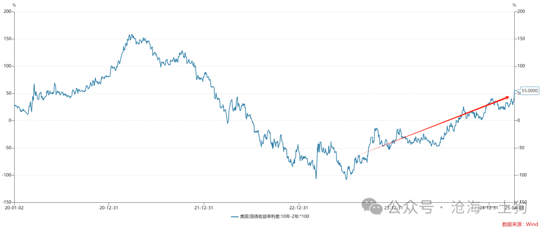 如上图所示,十年美债和两年美债的利差已经来到了55bp。