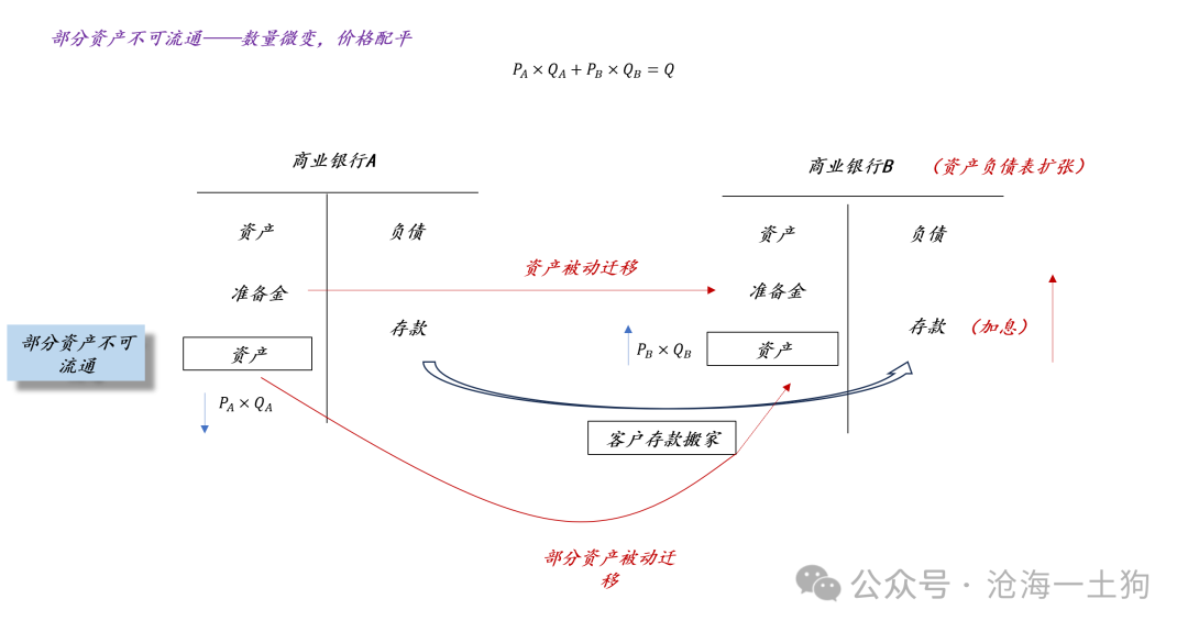 如上图所示,假设美联储是商业银行A,对手盘加息(ps:相当于美联储降息)会导致资本外流。但是,并不是所有的资产都能跟着存款跑出去,那些跑不出去的资产就要承担价格下行的压力。
