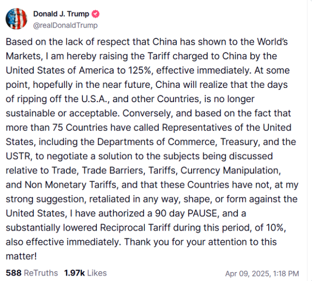 仅仅在今天,中国已经宣布对原产于美国的商品加征关税84%,随后特朗普宣布把针对中国征收的关税提高到125%,立即生效。且同时宣布,对75国给予90天的关税加征暂缓以及降低至10%的互惠关税,也立即生效。