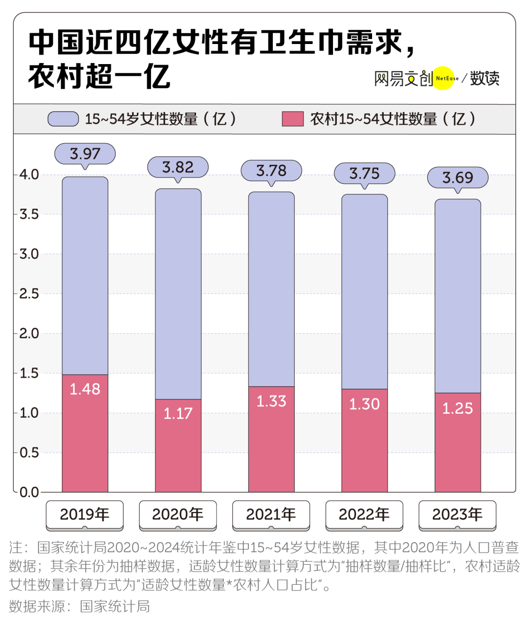 时间来到 2023 年,随着生产线不断增加,女性钱包越来越鼓,卫生巾使用习惯也逐渐养成。这一年卫生巾产量达 1010.6 亿片,可以给全体中国适龄女性每个月提供 20 多片卫生巾 [4]。