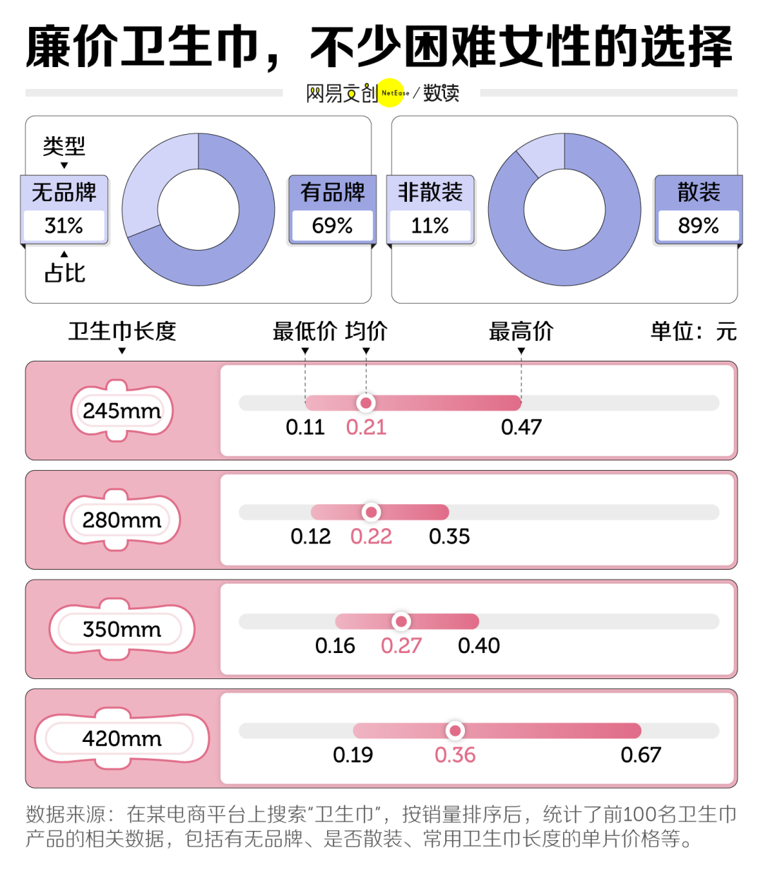 有需求,就有市场。在某电商平台上搜索“卫生巾”,按销量排序统计了前 100 名的数据后,我们发现,没有标注品牌的卫生巾占比 31%。同时,近 90% 为散装,打着“厂家直销、散装批发”的广告吸引有难处的女性。