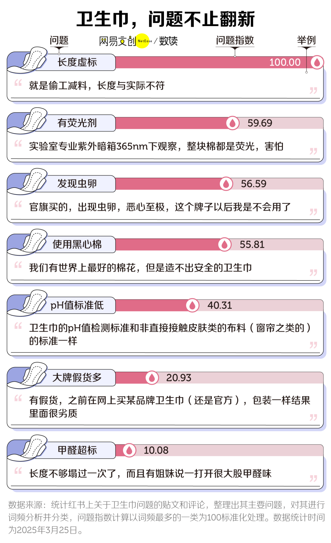 统计小红书中关于卫生巾的负面内容后,我们发现,一些大牌卫生巾也没少背刺女性。