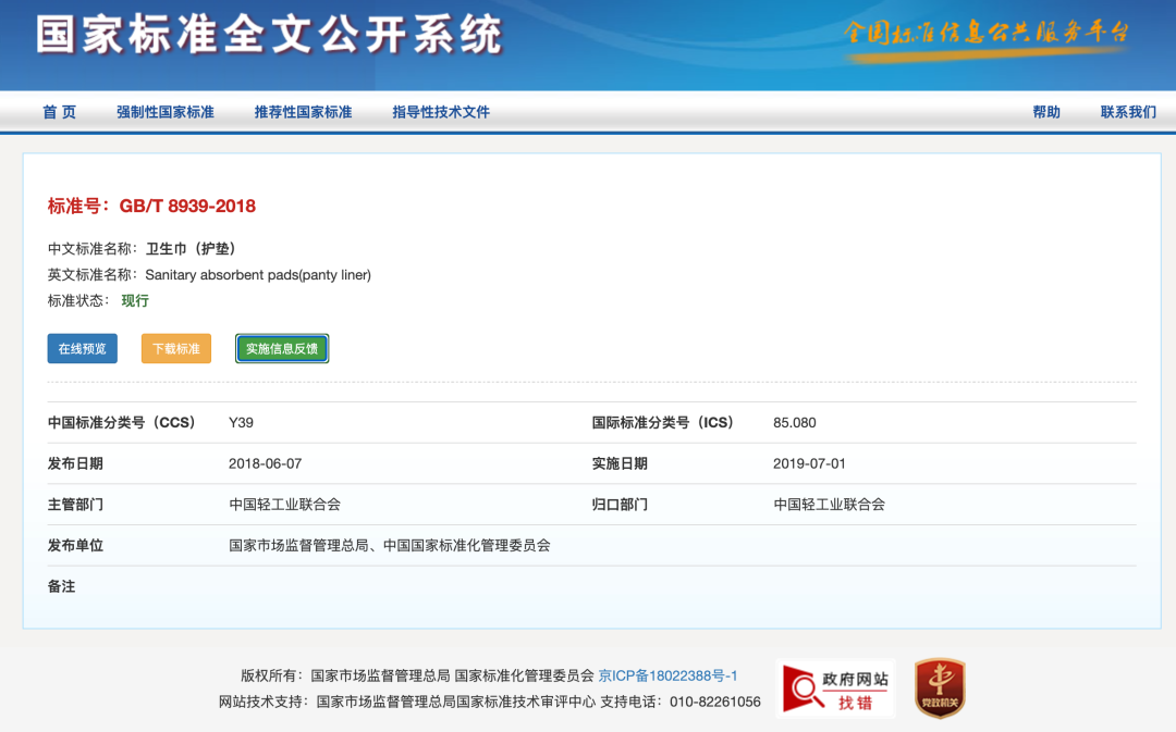 [16] 中国制浆造纸研究院有限公司, 福建恒安集团有限公司, 广州宝洁技术有限公司, 等. (2024). 卫生巾(护垫). 全国标准信息公共服务平台.