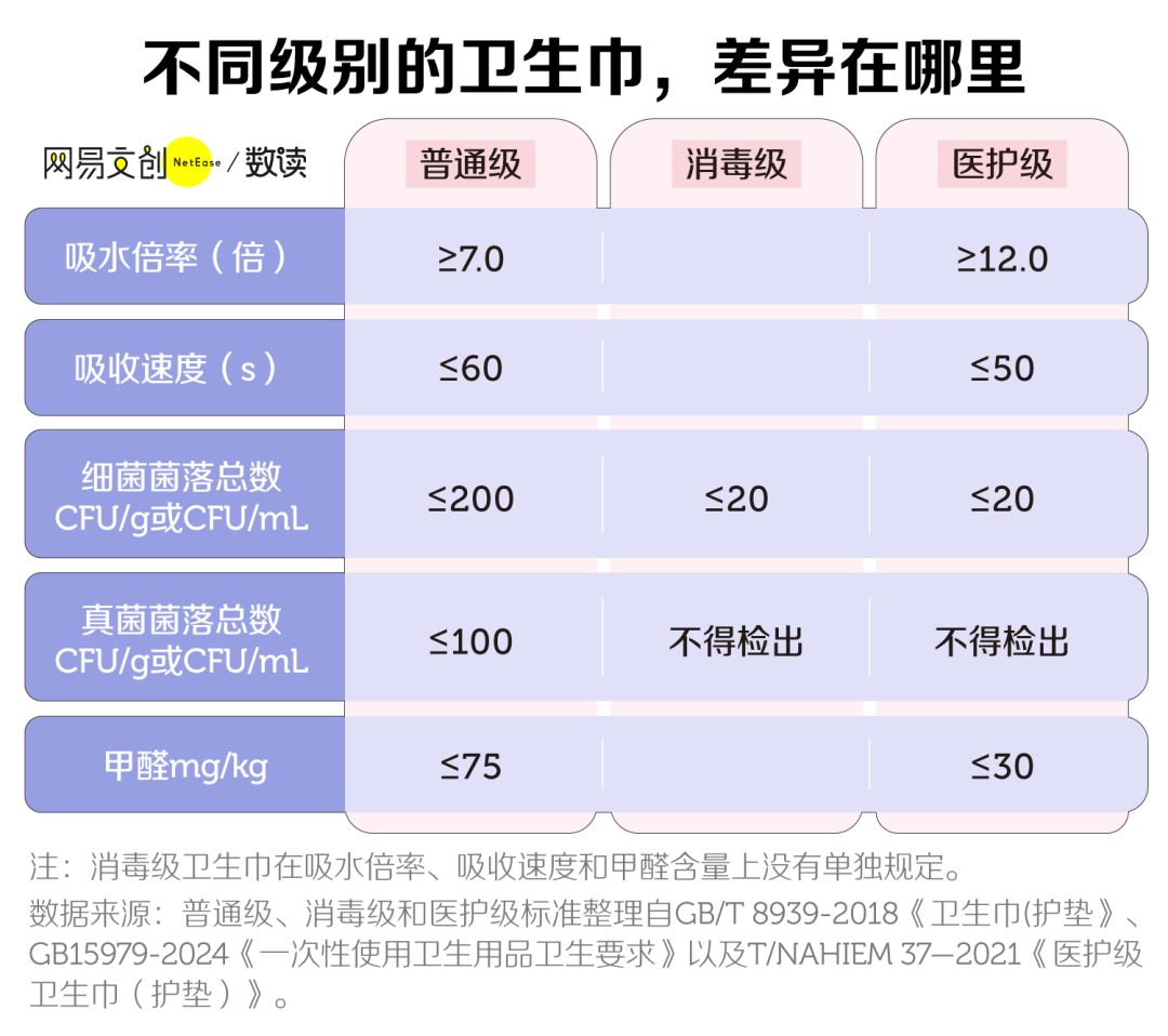 虽然从具体指标来看,医护级和消毒级卫生巾的卫生安全指标和其它特性都优于普通级,医护级的标准也比消毒级更高,但两者都达不到医用水平,也没有医疗器械备案凭证。