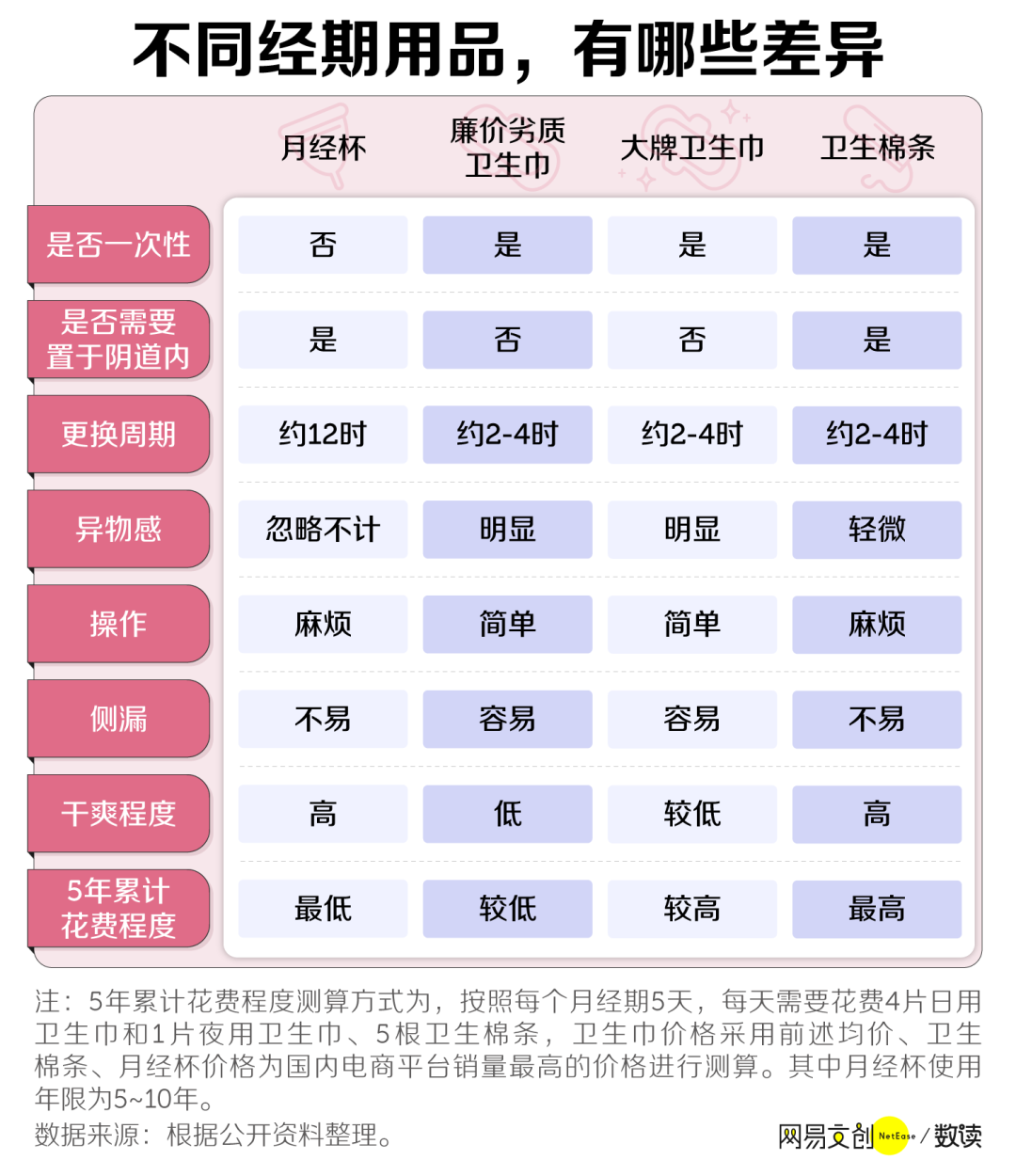 综合来看,性价比最高的是月经杯。我们统计电商平台热销的月经杯价格后发现,虽然其第一年花费较高,但由于可以反复使用,五年累计的花费甚至比廉价劣质卫生巾还要便宜 100 多元。