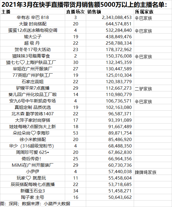 从快手3月份月带货额为5000万以上的主播看,除辛巴家族外,只有二驴家族的驴嫂平荣及牌牌琦家族的小伊伊还榜上有名。