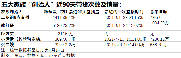 据小葫芦大数据显示,近90天以来,五大家族中,除了方丈是因为被封号(快手显示方丈的号将于4月26日解封)没有开播外,剩下的两大家族“创始人”的带货成绩也是平平。其中,小伊伊近90天直播带货7场,销售额7286万元;张二嫂直播带货两场,销售额657万。