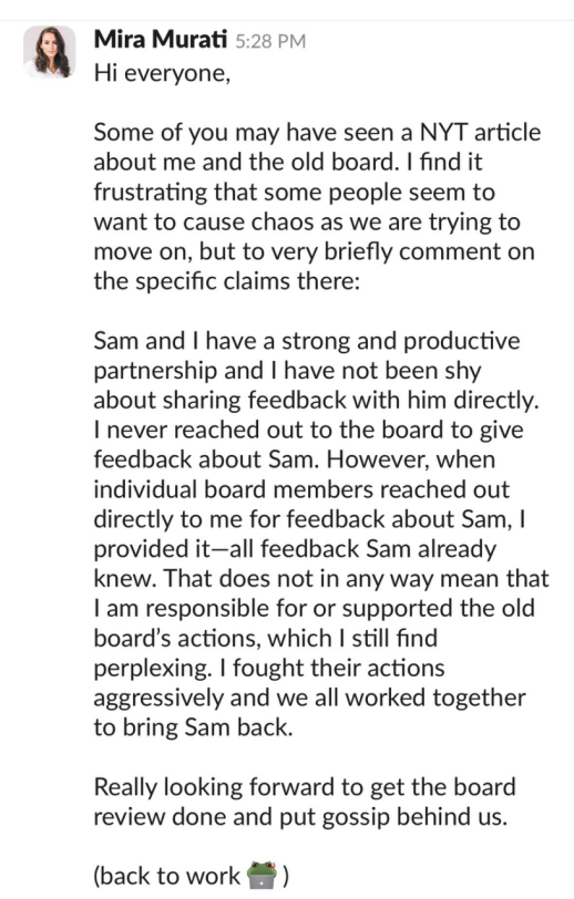 但有意思的地方在于,董事会开除奥特曼的动作太过突然,且语焉不详,导致OpenAI员工反弹剧烈。在这个时候,穆拉蒂和苏茨克维意识到,要让OpenAI不四分五裂的唯一方式就是奥特曼回归。于是,穆拉蒂要求董事会披露开除奥特曼的细节,后者没有做到后,她毅然站在了奥特曼一边。
