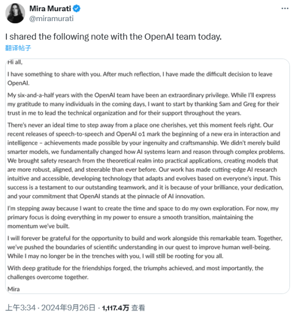 穆拉蒂在给员工的备忘录中表示,离开自己珍爱的地方永远没有理想的时机。之所以要离开,是要“进行自己的探索”。她特别提到,她当时在OpenAI的首要任务是确保平稳过渡,保持已经建立的势头。