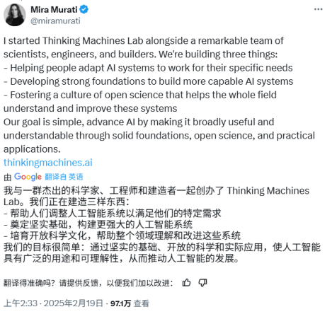 最终,在今年2月,穆拉蒂终于揭晓她的新公司名叫Thinking Machines Labs,宗旨是开发以人机协作为中心的下一代AI系统,而非追求完全自主的超强AI。