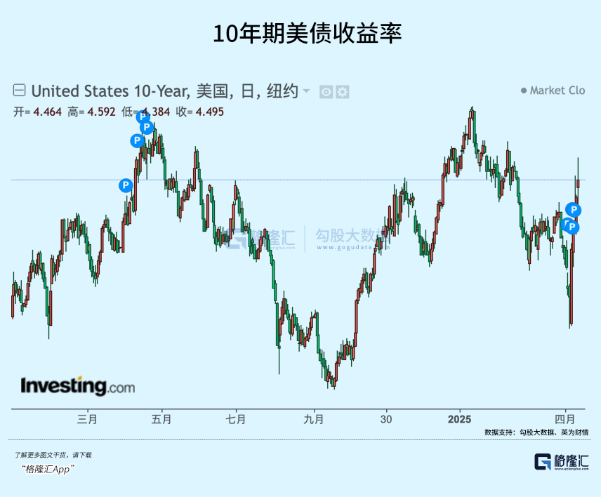 从4月2日特朗普宣布对几乎所有国家征收“对等关税”以来,10年期美债收益率上升了超过40个基点。