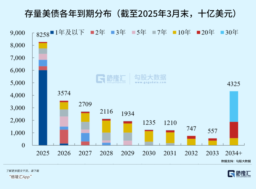 下面这张广为流传的美国债务期限结构强化了市场的紧张情绪。今年有超过8万亿美元的存量美债要到期,而按照之间的比例,美国还需要24.5%的海外投资者吃下新的债务。