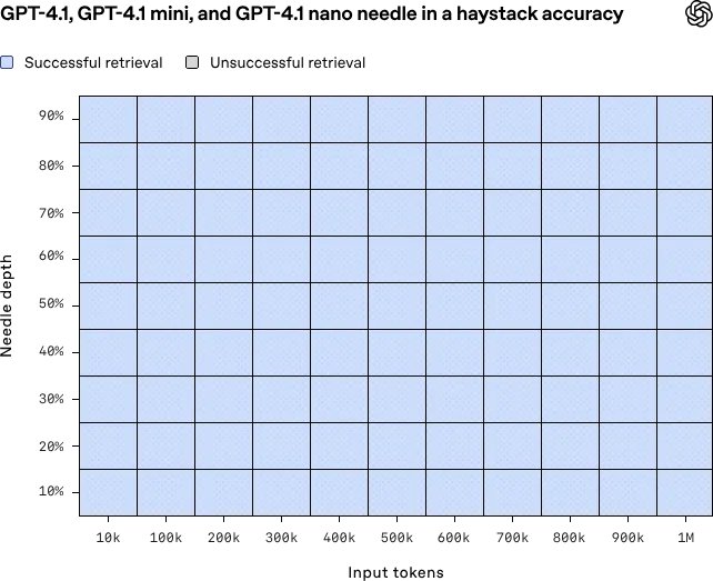 全系标配且真正“可用”的百万级长文本处理能力,是GPT-4.1系列的另一大重点。不仅旗舰版GPT-4.1,连同mini和nano版本,都支持高达100万Token的上下文窗口(远超GPT-4o的128k)。OpenAI此次特别强调,这不仅仅是窗口大小的提升,更在于模型在如此长的文本中保持专注和理解的能力得到了强化。经典的“大海捞针”(Needle in a Haystack)测试结果显示,GPT-4.1系列能在1M长度的文本中稳定、准确地找到隐藏信息。