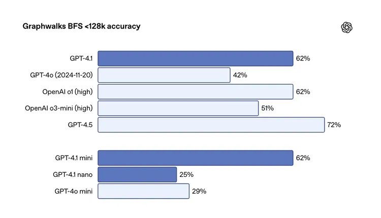 当然,处理百万Token的延迟也是开发者关心的,官方给出的初步数据是,GPT-4.1处理128k Token时首个Token的p95延迟约15秒,1M Token则可能需要半分钟左右,而mini和nano版本则会快得多。