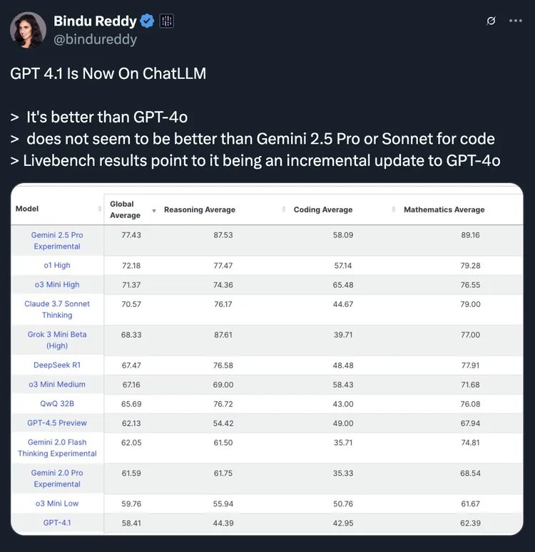 来自第三方基准平台(如与ChatLLM服务相关的Livebench)的早期结果在一定程度上支持了这种观点:虽然确认GPT-4.1相较于GPT-4o有所改进('It's better than GPT-4o'),但同时将其描述为一次“增量更新”(incremental update)。更值得注意的是,在OpenAI重点宣传的编码能力方面,该基准评估认为其表现“似乎并未优于Google的Gemini 2.5 Pro或Anthropic的Claude 3 Sonnet(或更高版本模型)”。这似乎意味着AI领域的竞争已进入到更细分、更针对性的能力比拼阶段,而非全面的代际碾压。