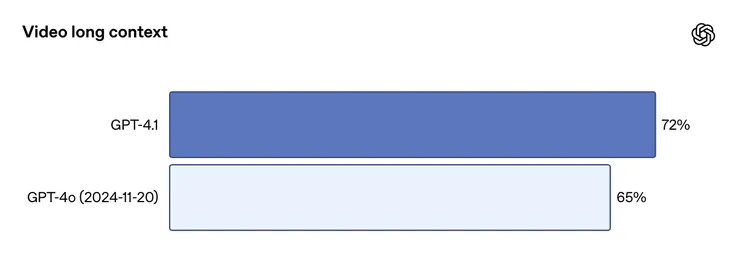 此外,GPT-4.1家族的视觉理解能力也保持了高水准。特别是GPT-4.1 mini,在MMMU、MathVista等多个视觉基准测试上的表现甚至优于GPT-4o。旗舰版GPT-4.1则在长视频理解基准Video-MME(无字幕长视频问答)上取得了72.0%的新SOTA成绩。