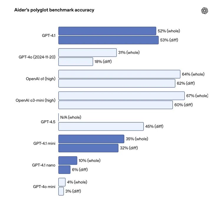 GPT-4.1的发布,被一些市场观察者解读为OpenAI对Anthropic和Google等竞争对手近期积极动作的回应,而非一次颠覆性的技术突破。有不少评论直接指出,尽管进步显著,但在某些特定基准上,如Aider Polyglot编码测试,GPT-4.1(约52%)与Google Gemini 2.5 Pro(据报道约73%)相比仍有差距。