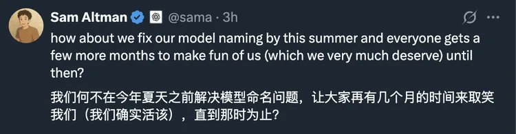 而谈及OpenAI,其“迷幻”的命名体系总是绕不开的话题。从GPT-4o、4.5、4.1,到内部代号般的o1、o3、o4系列(还分low/medium/high/mini/pro各种后缀),再到ChatGPT界面上令人困惑的模型选项(4o、o3-mini、o1、Deep Research、4.5、带任务调度的4o...),“像正常人一样给模型命名”似乎成了一项不可能完成的任务。这对于一个力求普及AI技术的公司而言,无疑增加了用户的理解成本。