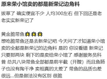 2023年,我们就观察到,新荣记398元的“穷鬼套餐”在社交平台走红,后来集团旗下更平价的“荣小馆”的早餐又成为必打卡美食。有网友爆料“荣小馆卖的带鱼是新荣记挑剩下的边角料”,若属实,也不失为一种高端线降低损耗率的方法。