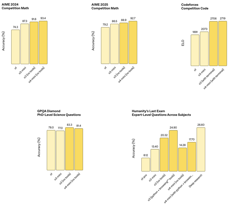 o4-mini则是一款针对速度和成本效益优化的“小钢炮”。虽然体量更小,但它在数学、编码和视觉任务上实现了“令人瞩目的性能”,堪称“以小博大”的典范。它在AIME 2024和2025数学竞赛基准上的表现甚至超越了更大的模型。