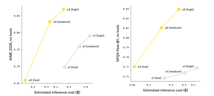 值得关注的是,智能化程度的提升并未必然带来成本的增加。OpenAI强调,在许多实际应用场景中,o3和o4-mini可能比它们的前代o1和o3-mini更高效,甚至更便宜。官网展示的AIME数学竞赛成本-性能曲线清晰地表明,o3在相同成本下性能优于o1,而o4-mini则优于o3-mini。