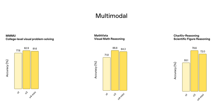 Agentic Tool Use是本次发布的亮点之一。过去的模型虽然也能调用工具,但往往是被动执行指令。而o3和o4-mini则被训练得能够思考何时以及如何使用工具来给出详尽、周到的答案。它们可以根据问题的复杂性,自主决定调用网页搜索获取最新信息、运行Python代码进行数据分析和预测、理解用户上传的图片内容,甚至生成图表或图像来辅助说明。