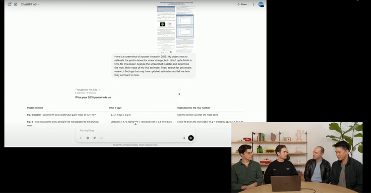在演示中,OpenAI的Brandon McKenzie向o3展示了一张关于质子等矢标量荷的物理海报,并要求它找到研究结果并与最新文献对比,实际上该结果并未写在海报上。o3准确识别了相关图表,推理出计算方法,并联网查找最新估计值,指出原始数值需重整化才能与当前研究对齐,展现了其理解图像、推理及使用工具完成复杂科研任务的能力,节省了时间。