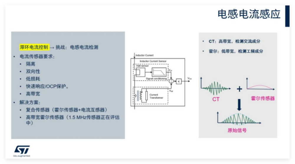 ST目前采用的是一种复合方案,即将霍尔传感器与电流互感器(CT)结合使用。CT主要用于检测交流高频成分,即电感电流中的高频电纹电流部分;霍尔传感器负责检测工频成分。两者采集的信号叠加后,能够得到反映实际电感电流的原始信号。此外,ST也在对高带宽霍尔传感器进行评估,探索更优的电流检测解决方案。