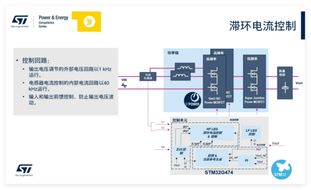 方案利用STM32G474内部的DAC、快速比较器和高分辨率定时器(HRTIM)实现滞环控制、ZVS(零电压开关)控制和驱动信号输出。控制回路包含一个1kHz运行的电压外环,主要作用是稳定输出电压,使其保持在设定值;一个40kHz运行的电流内环,用于精确控制电感电流。同时,还引入了输入和输出前馈控制,有效防止输出电压波动,提高系统稳定性。