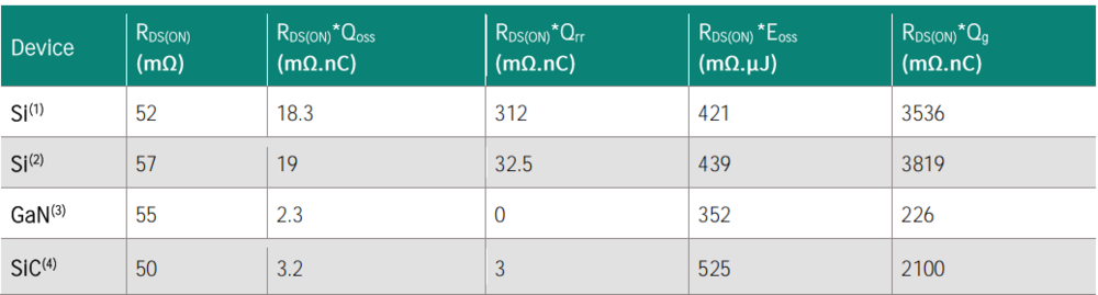 宽禁带器件的优势:SiC和氮化镓GaN具有更高的品质因数(FoM),在效率和功率密度方面表现更优。与硅晶体管相比,GaN晶体管输出电荷更低,无体二极管恢复问题,反向恢复电荷低,栅极电荷低,温度系数低;SiC MOSFET的反向恢复电荷低,导通电阻随温度变化小,输出电荷低且更线性,栅极电荷低。