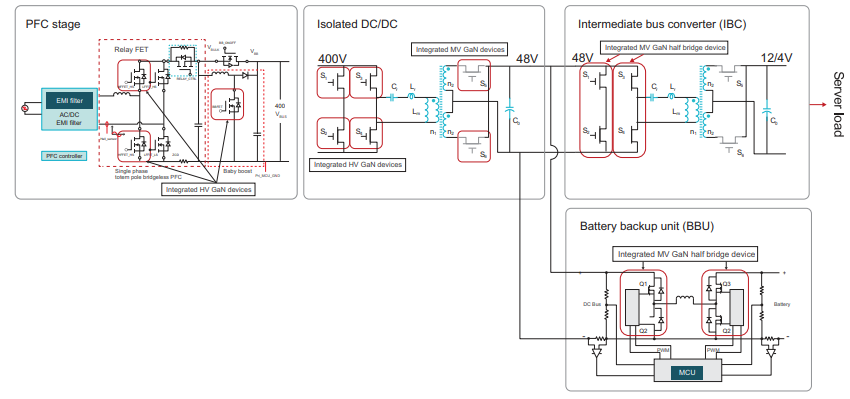 中间总线转换器(IBC):此系统将PSU输出的中间电压(48V)转换为较低的电压,然后传送至服务器。随着48V电压电平的流行,IBC有助于减少服务器子系统中的I 2R损耗,并使汇流条和电力传输线的尺寸和成本都得到降低。IBC的缺点是其在电源转换中又增加了一步,可能会对效率产生影响。因此,除了OEM经测试可获得高效率和高功率密度最佳组合的几种新拓扑外,请务必充分利用LMG2100和LMG3100等高效GaN器件。